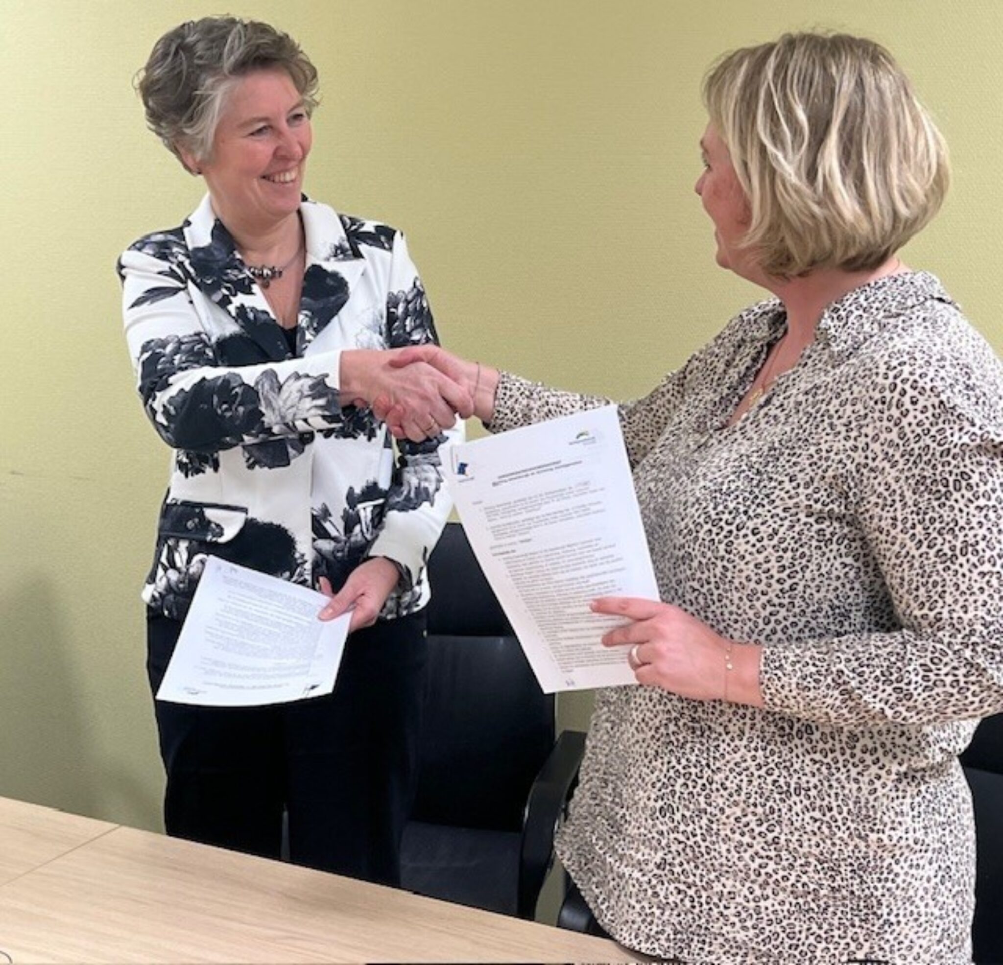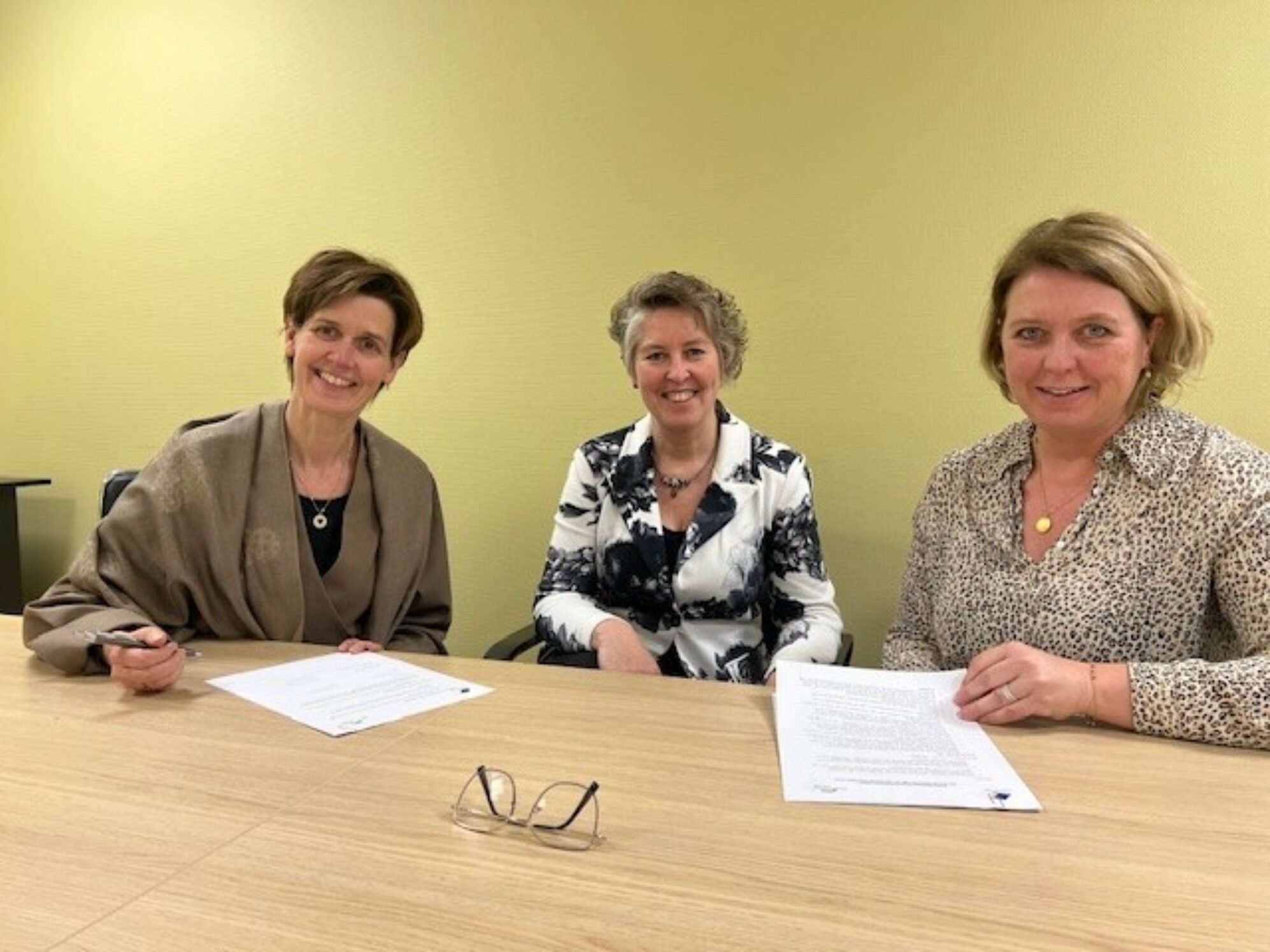 Op de foto van links naar rechts: Mariska de Groot (Voorzitter Raad van Bestuur), Marga Hoogendoorn (Manager Ziekenhuis) en Laura Wiersma (Voorzitter Vechtgenotenhuis) ondertekenen de overeenkomst.